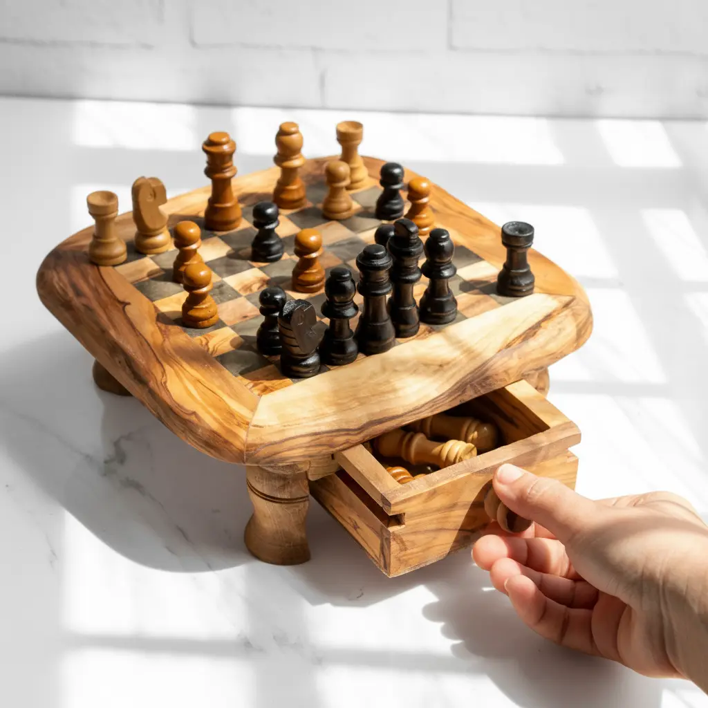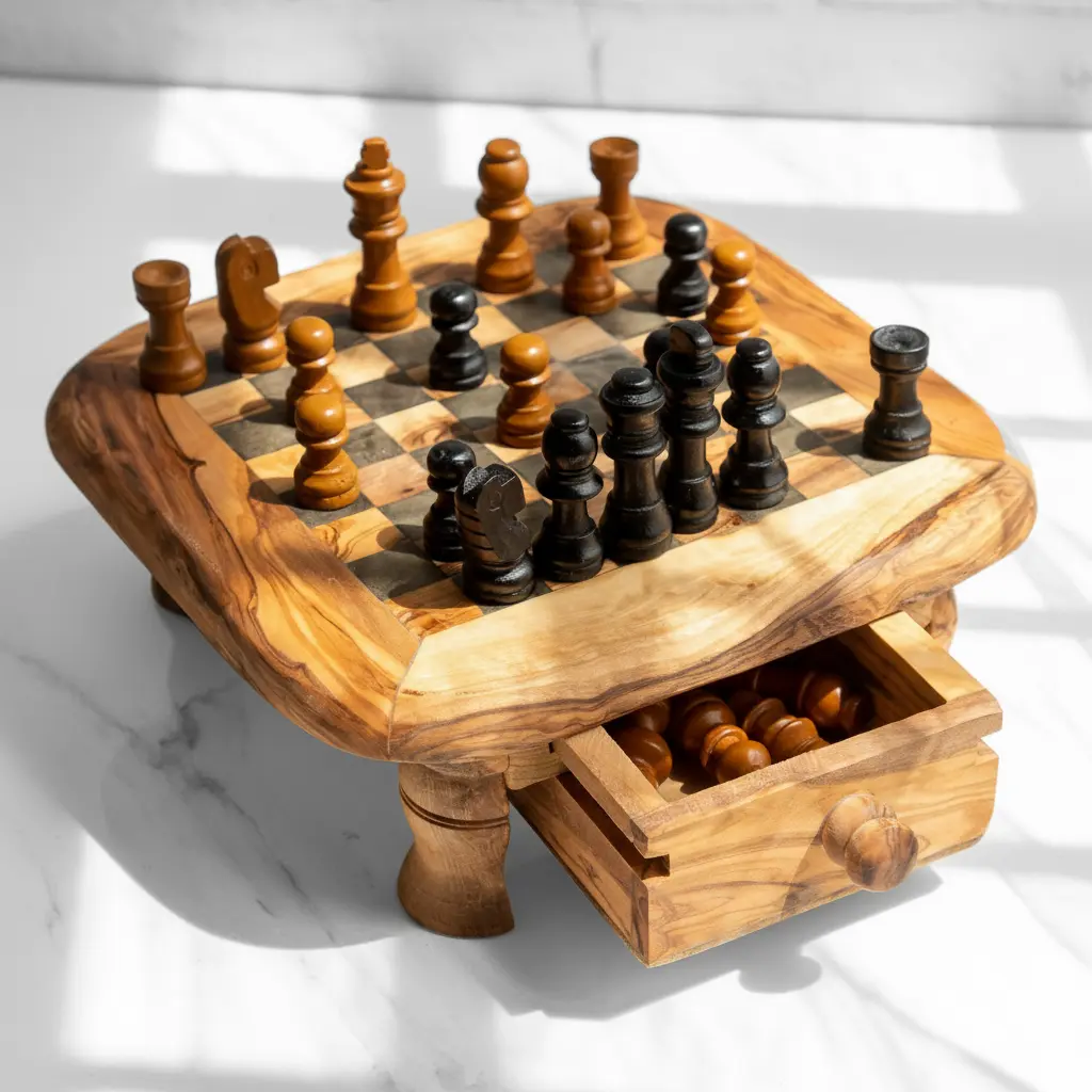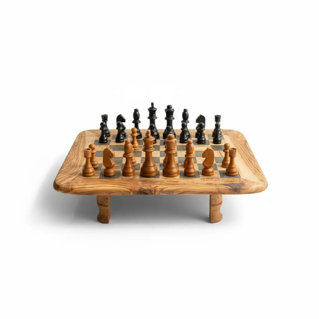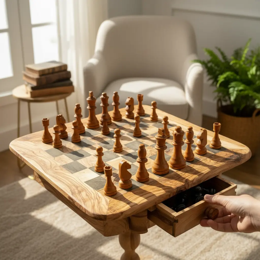 Artisraw presents a sophisticated hardwood chess set that transforms into a complete game table with integrated legs. This standalone piece features a unique round-edged design that provides both safety and elegant aesthetics. Crafted from premium hardwood materials, this chess board table serves as both a functional game surface and a beautiful furniture addition to any room. The integrated leg design creates a stable playing surface perfect for serious chess enthusiasts and casual players alike.