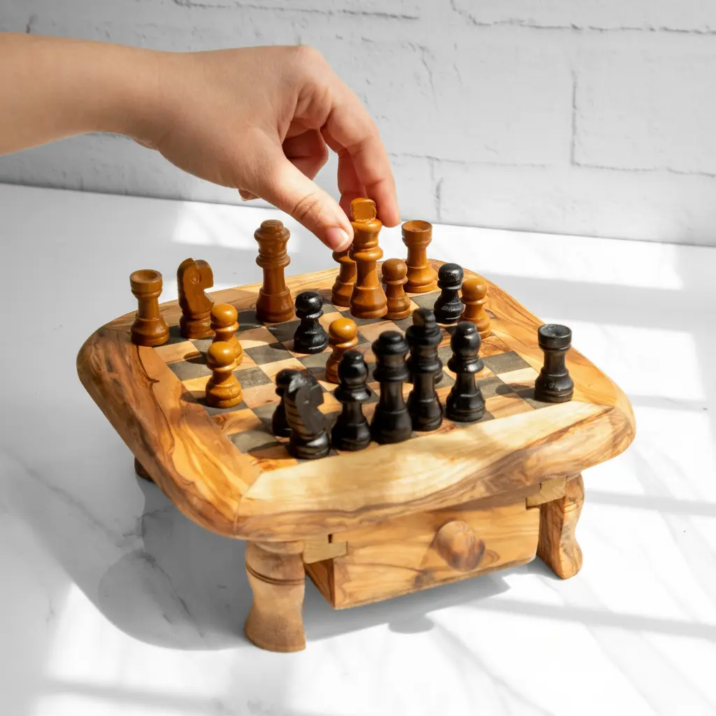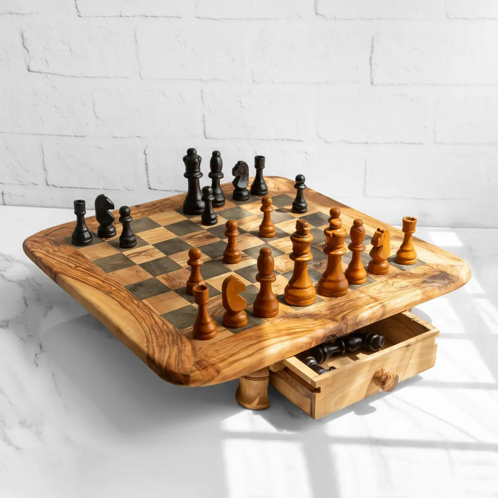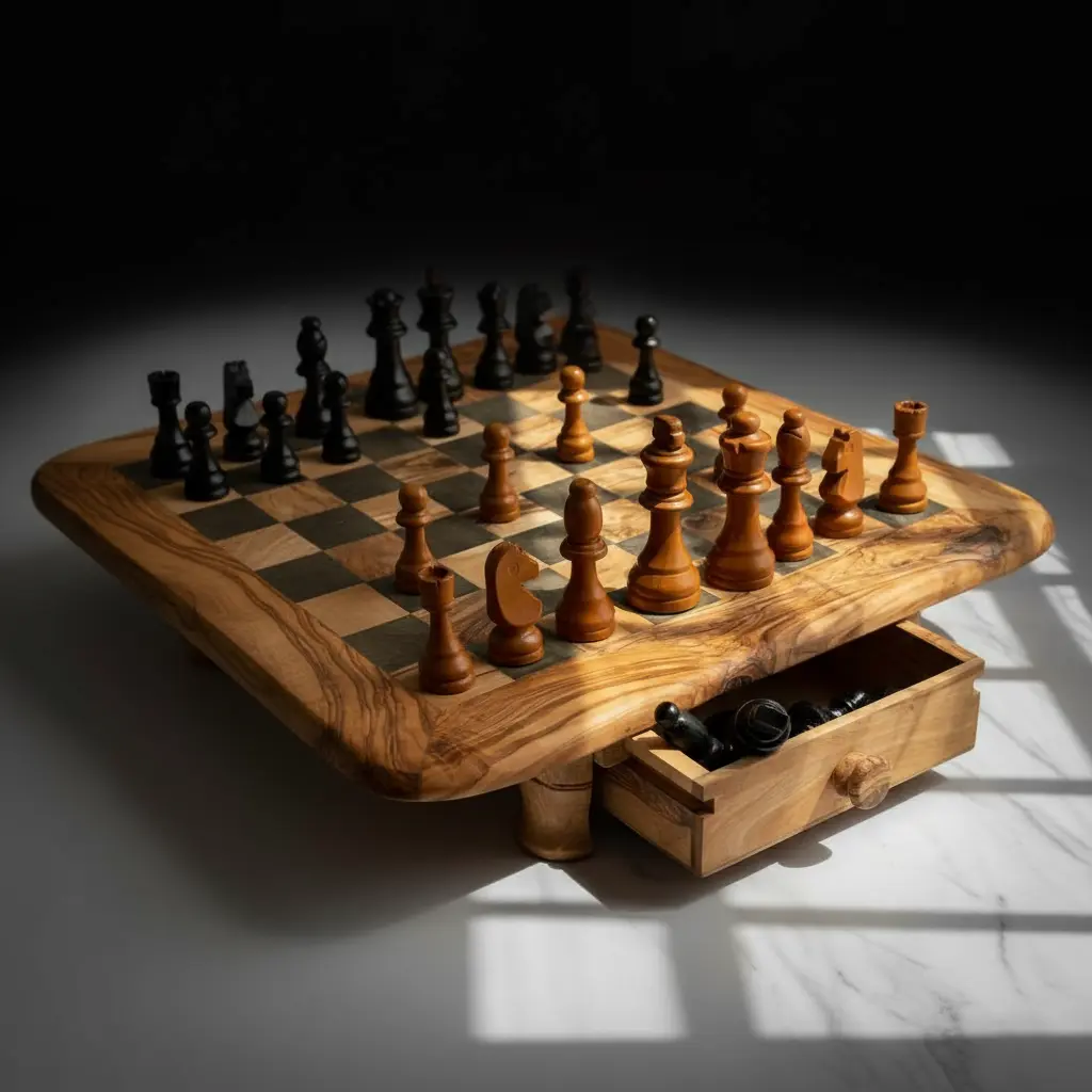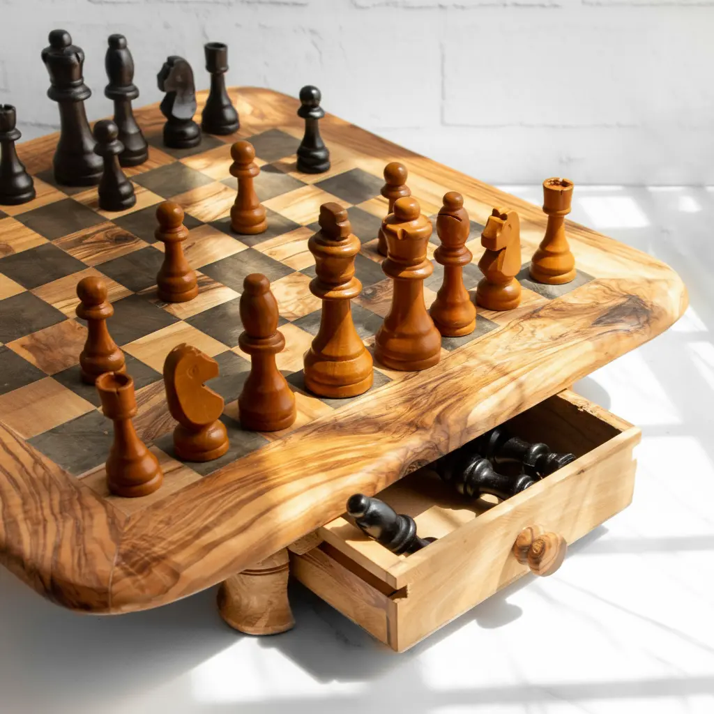 Artisraw presents a sophisticated hardwood chess set that transforms into a complete game table with integrated legs. This standalone piece features a unique round-edged design that provides both safety and elegant aesthetics. Crafted from premium hardwood materials, this chess board table serves as both a functional game surface and a beautiful furniture addition to any room. The integrated leg design creates a stable playing surface perfect for serious chess enthusiasts and casual players alike.