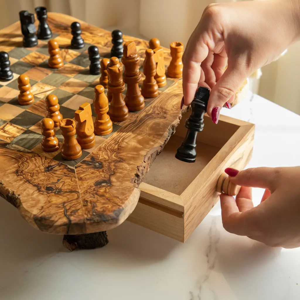 This innovative chess board includes convenient built-in storage compartments designed to securely hold all your chess pieces. No more searching for missing pieces or dealing with separate storage containers. The integrated storage system keeps your complete chess set organized and protected when not in use. The thoughtful design ensures that all pieces have their designated spaces, making setup and cleanup quick and effortless. This practical feature makes the board ideal for regular use while maintaining its elegant appearance.