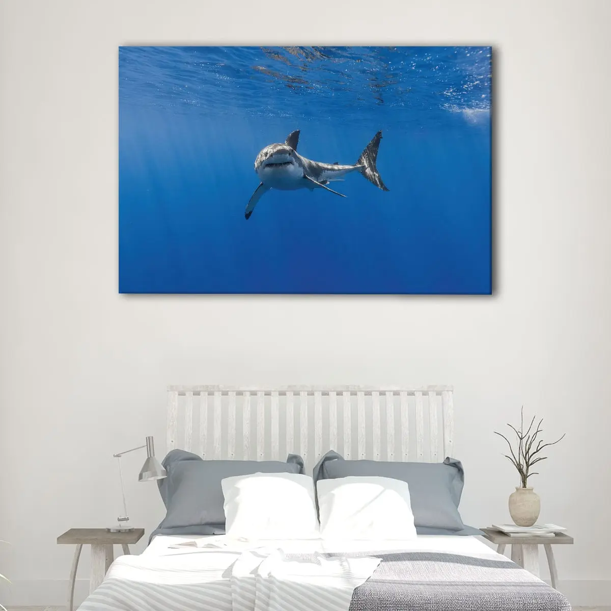 This stunning shark underwater canvas art is a breathtaking addition to any room in your home. Hand-stretched over 100% natural wood stretcher bars, it comes ready-to-hang with metal saw-tooth hangers, requiring no additional framing.