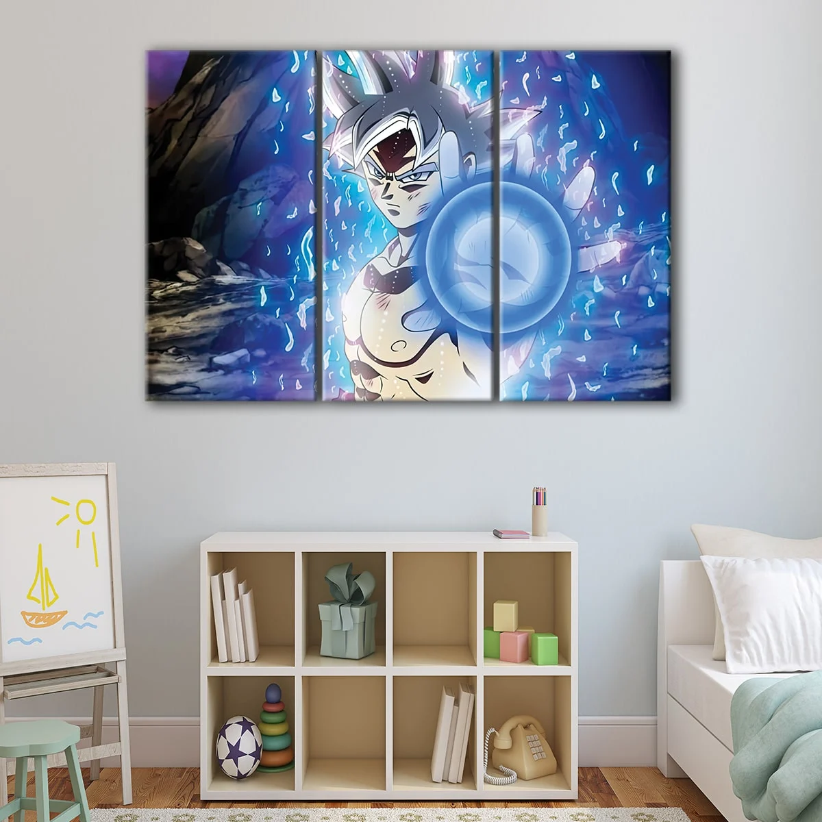 This stunning Son Goku Ultra Instinct canvas art is a must-have for any Dragon Ball Super fan. 100% ready-to-hang with metal saw-tooth hangers on the back, and no additional framing required, making it easy to hang in your living room, hallway, or kids room. The canvas is carefully hand-stretched over 100% natural wood stretcher bars by expert craftsmen.