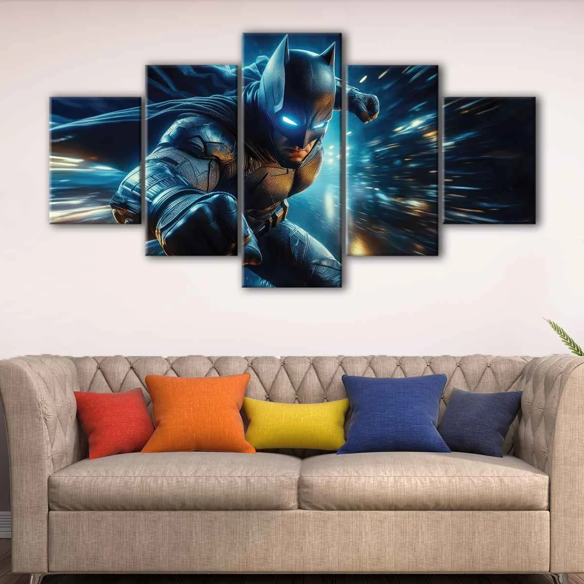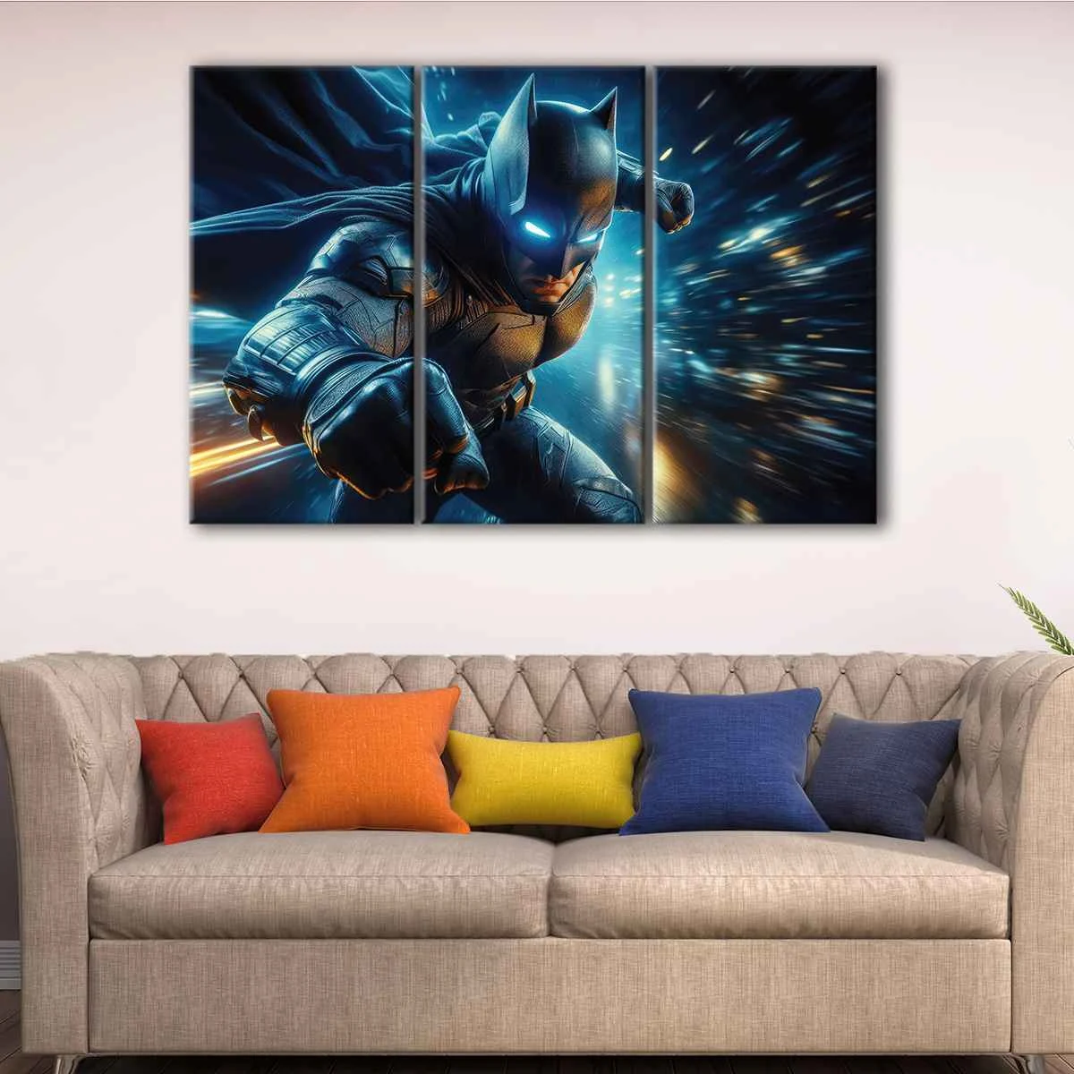 This Batman wall art is available in various sizes, from small to oversized canvas prints, and can be perfectly placed in your living room, hallway, kids' room, or dining room. You can choose from a single panel canvas wrap, 3 panels canvas wrap, or one of our other premium options.