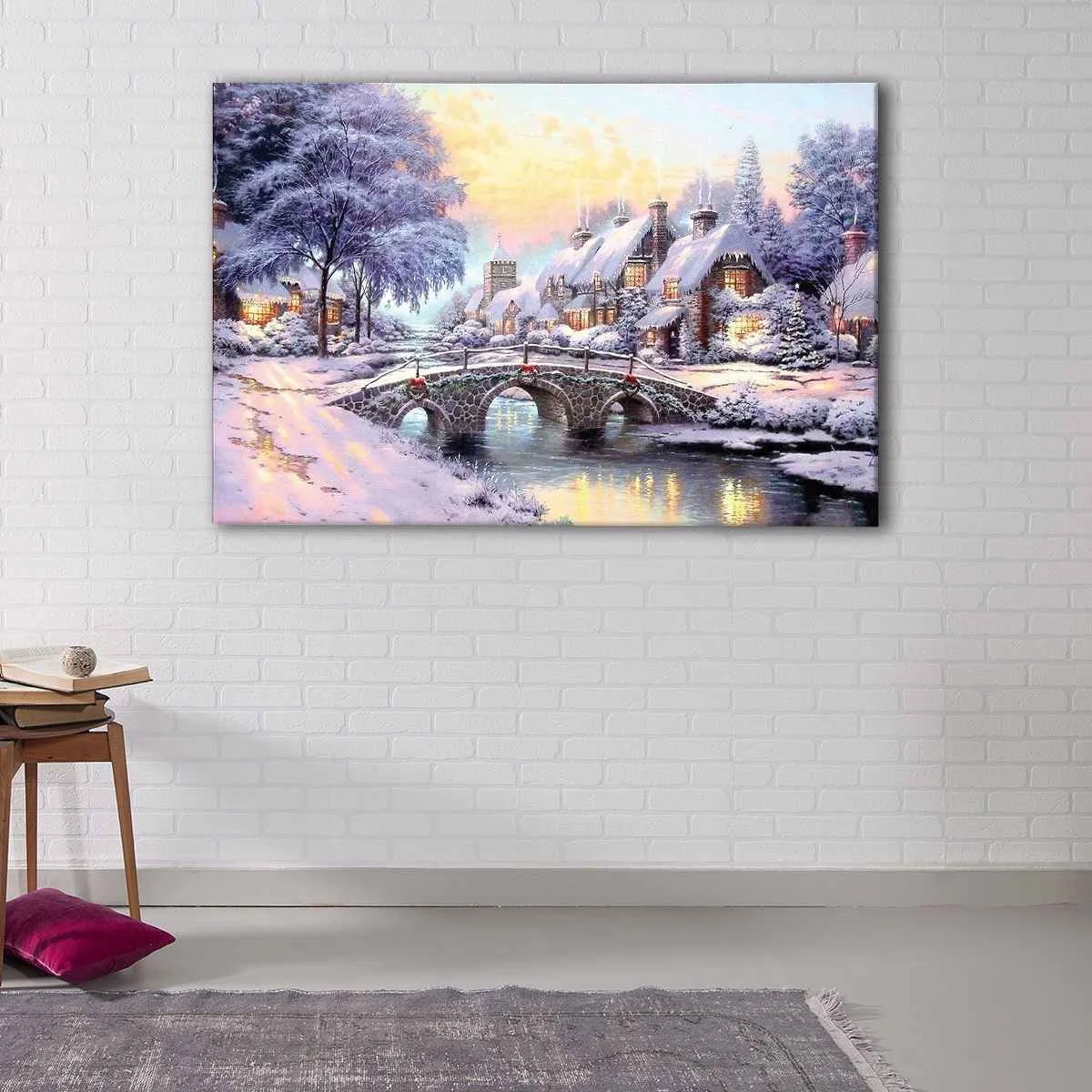 This stunning Cobblestone Christmas Painting canvas art comes ready-to-hang with metal saw-tooth hangers on the back, requiring no additional framing. The canvas is carefully hand-stretched over 100% natural wood stretcher bars by our expert craftsman. We combine premium poly-cotton canvas with pigment-archival inks to offer high-definition prints with vivid colors that last for 100+ years.