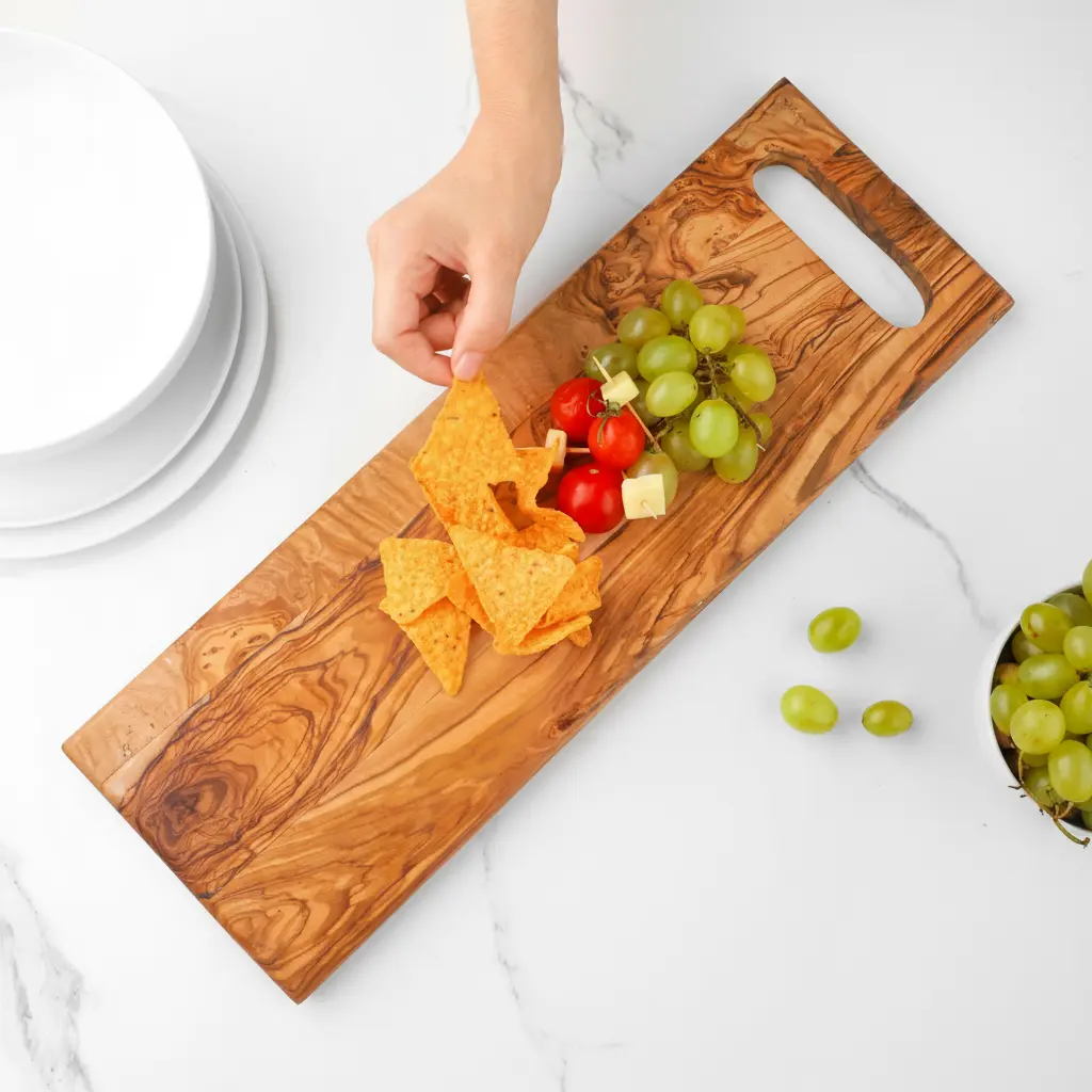 This Olive Wood Cutting Board from Artisraw's The Green Family collection is crafted from solid olive wood, renowned for its durability and unique, beautiful grain patterns. Each board is one-of-a-kind, showcasing the natural character of the wood. The material is naturally antibacterial, making it a hygienic choice for all your food preparation needs. Its hard surface is surprisingly gentle on knife blades, helping to maintain their sharpness over time.