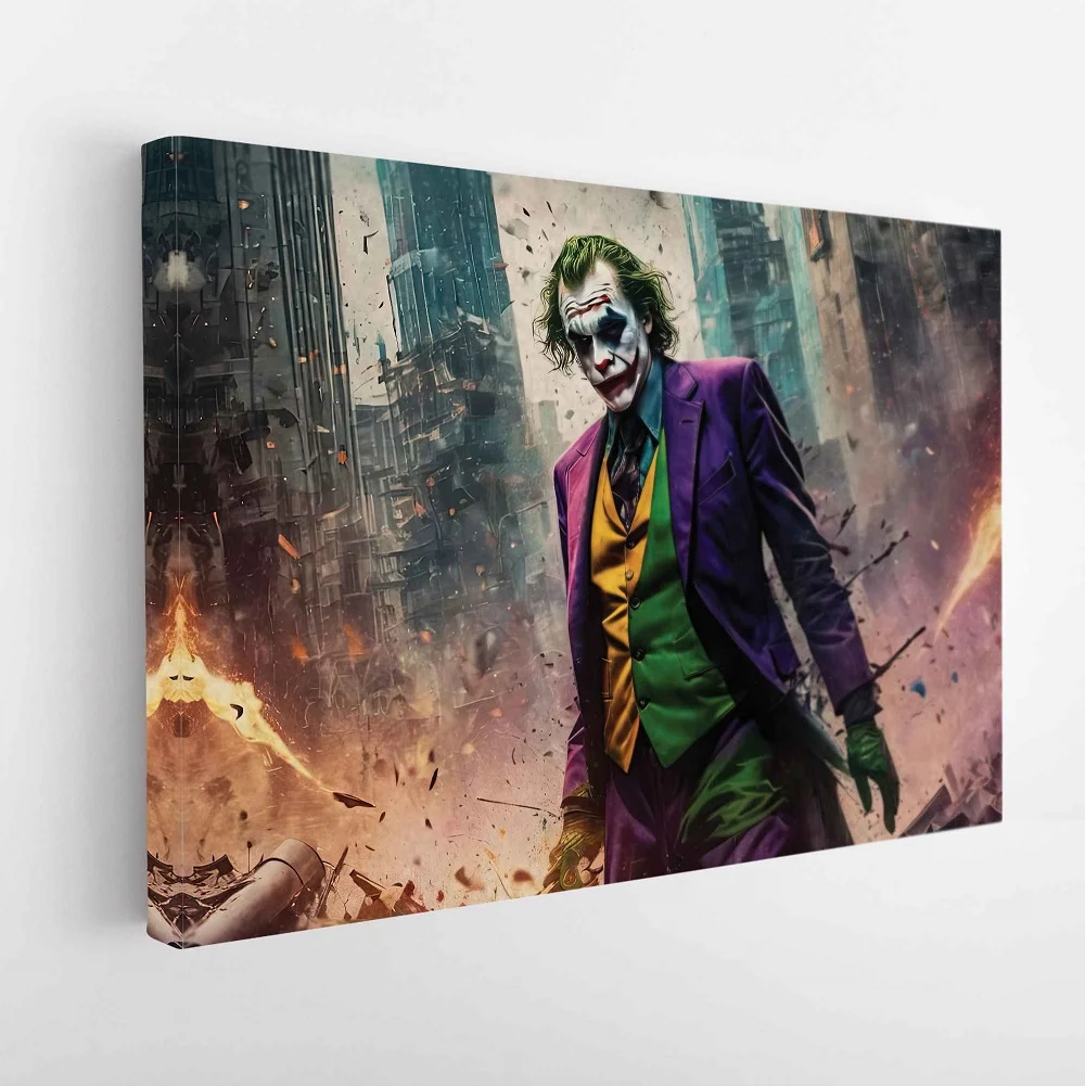 This stunning Joker Mess canvas art arrives ready-to-hang with metal saw-tooth hangers on the back, eliminating the need for additional framing. Expert craftsmen hand-stretch premium poly-cotton canvas over 100% natural wood stretcher bars to produce high-definition prints with vibrant colors that last for 100+ years.
