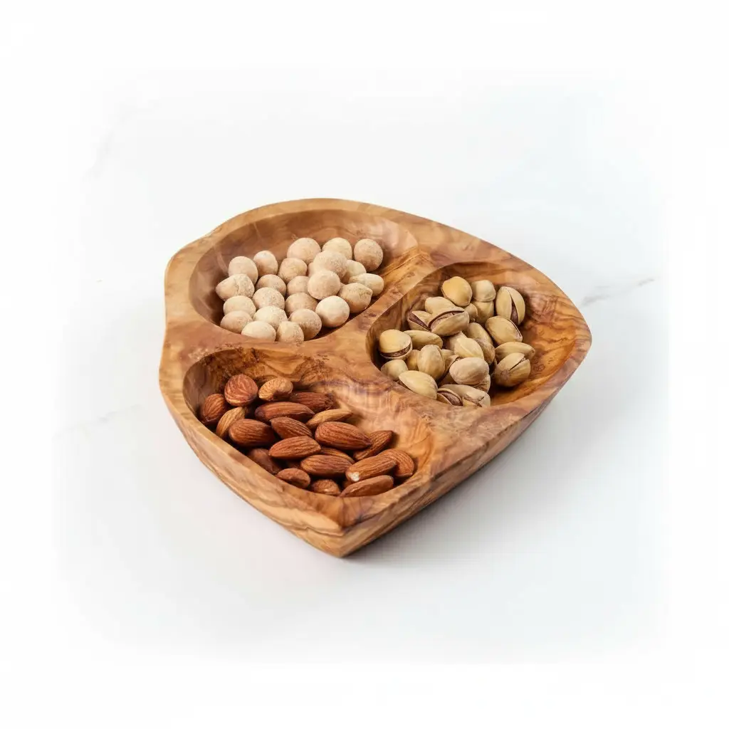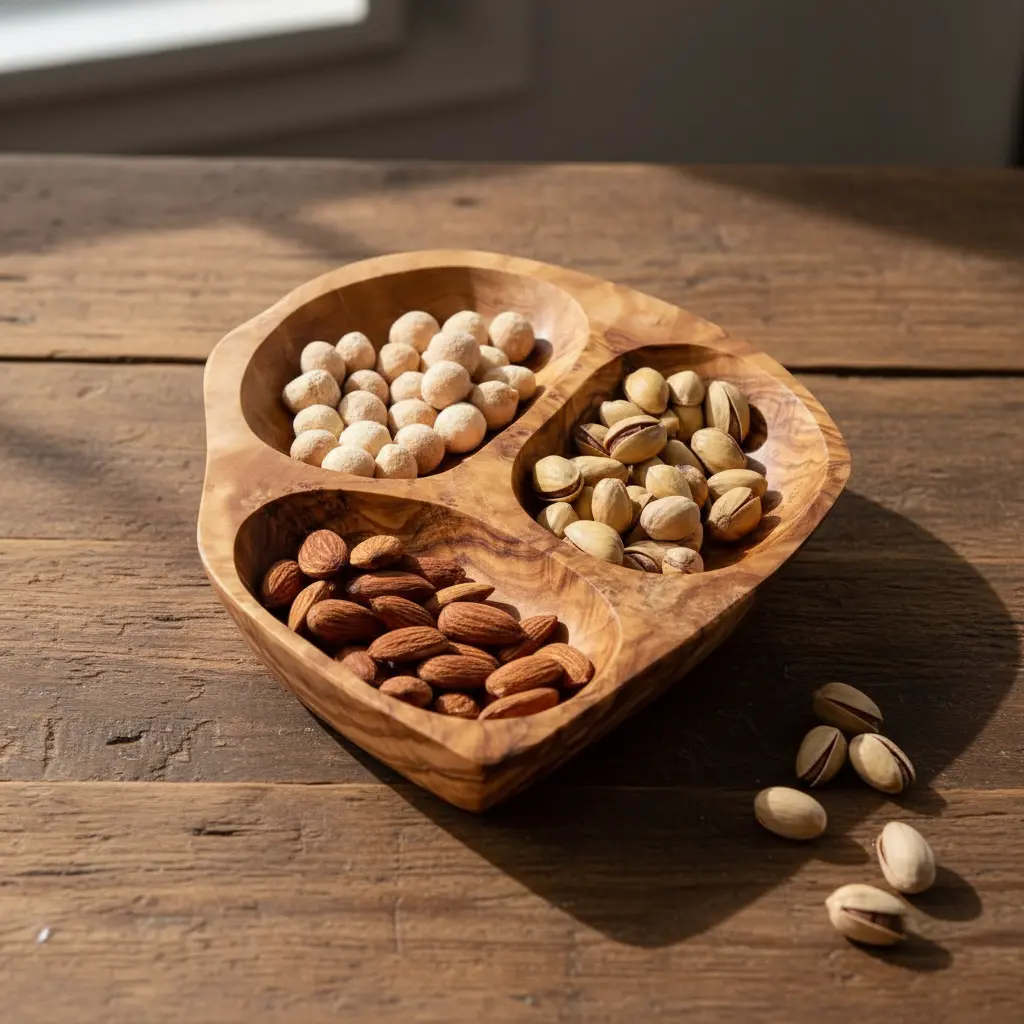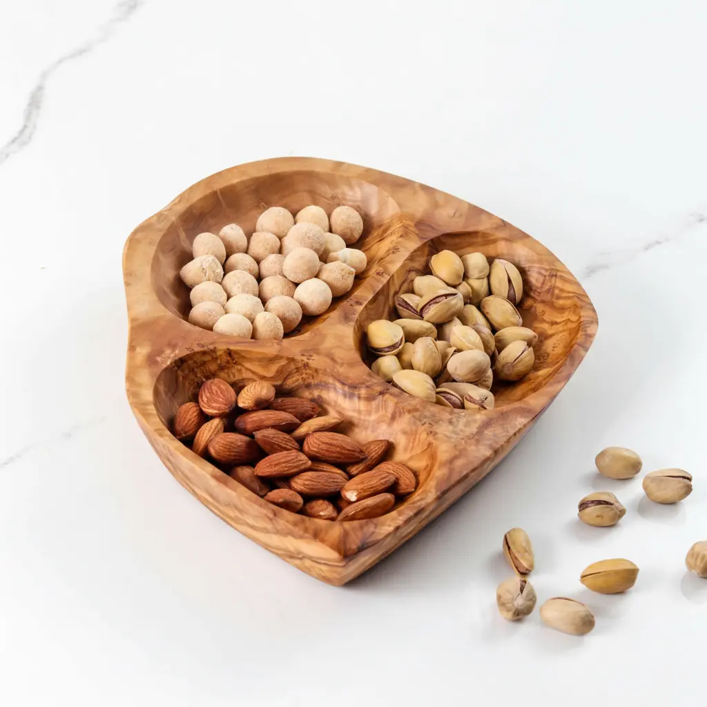 The divided design makes this serving platter ideal for organizing olives, nuts, dips, cheeses, and appetizers in separate sections. Its versatile compartments allow you to serve multiple items simultaneously while keeping them neatly separated. The natural antibacterial properties of olive wood make it a hygienic choice for food presentation, ensuring your snacks and appetizers remain fresh and safe for consumption.