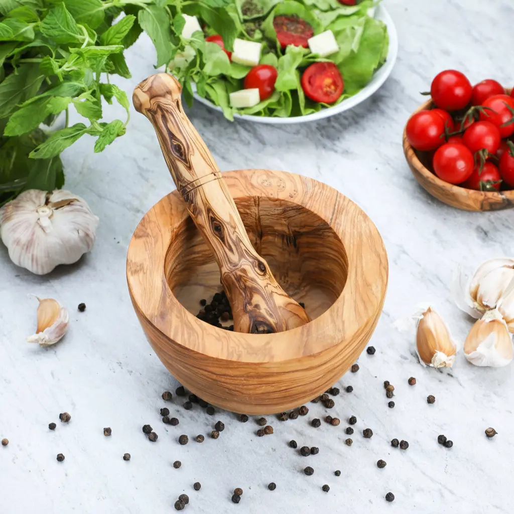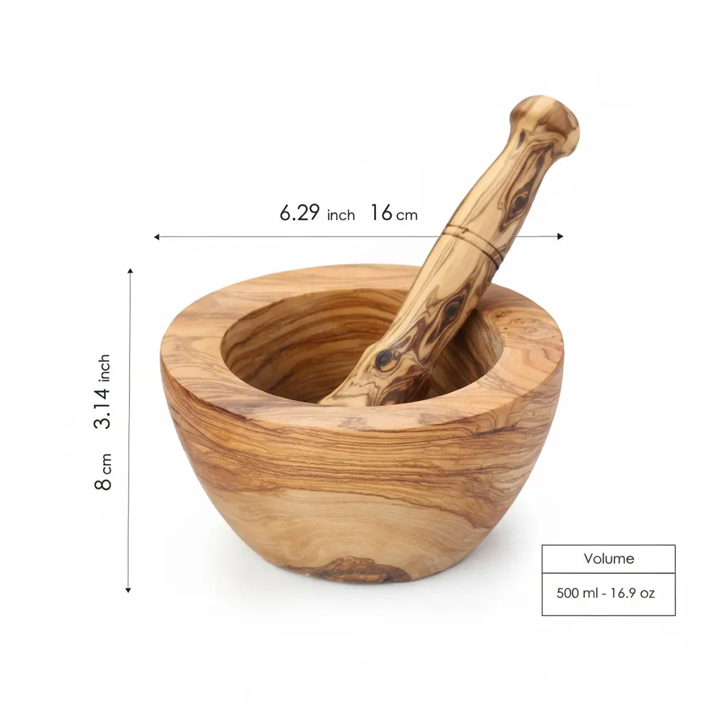 Designed for optimal functionality, this mortar and pestle excels at grinding spices, herbs, and creating flavorful pastes. The deep bowl provides ample space for mixing, while the sturdy pestle offers perfect control for crushing ingredients. Unlike metal or plastic alternatives, olive wood won't absorb odors or flavors, ensuring pure taste in every dish you prepare.