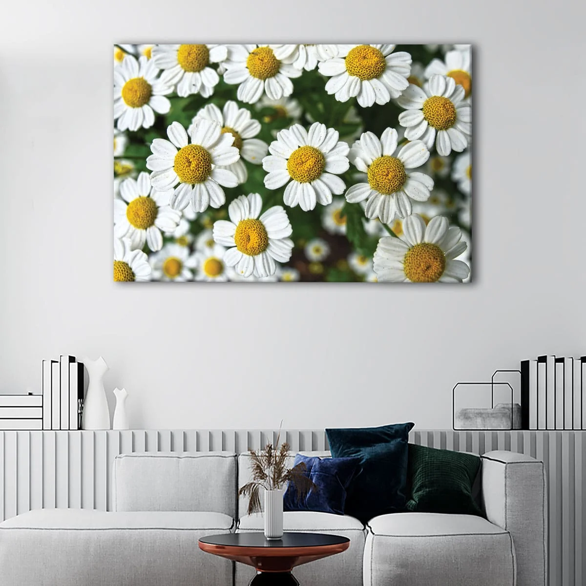 This daisy flowers wall art is available in 1, 3, or 5-panel configurations, as well as in various sizes, from small to oversized canvas prints. Its versatility makes it an ideal choice for any room, whether it's your living room, hallway, kids' room, or dining room.
