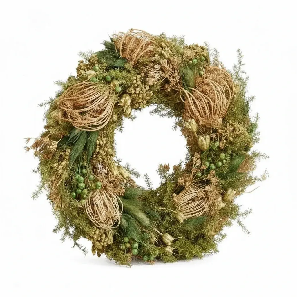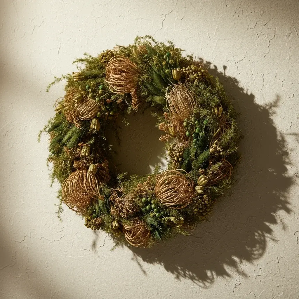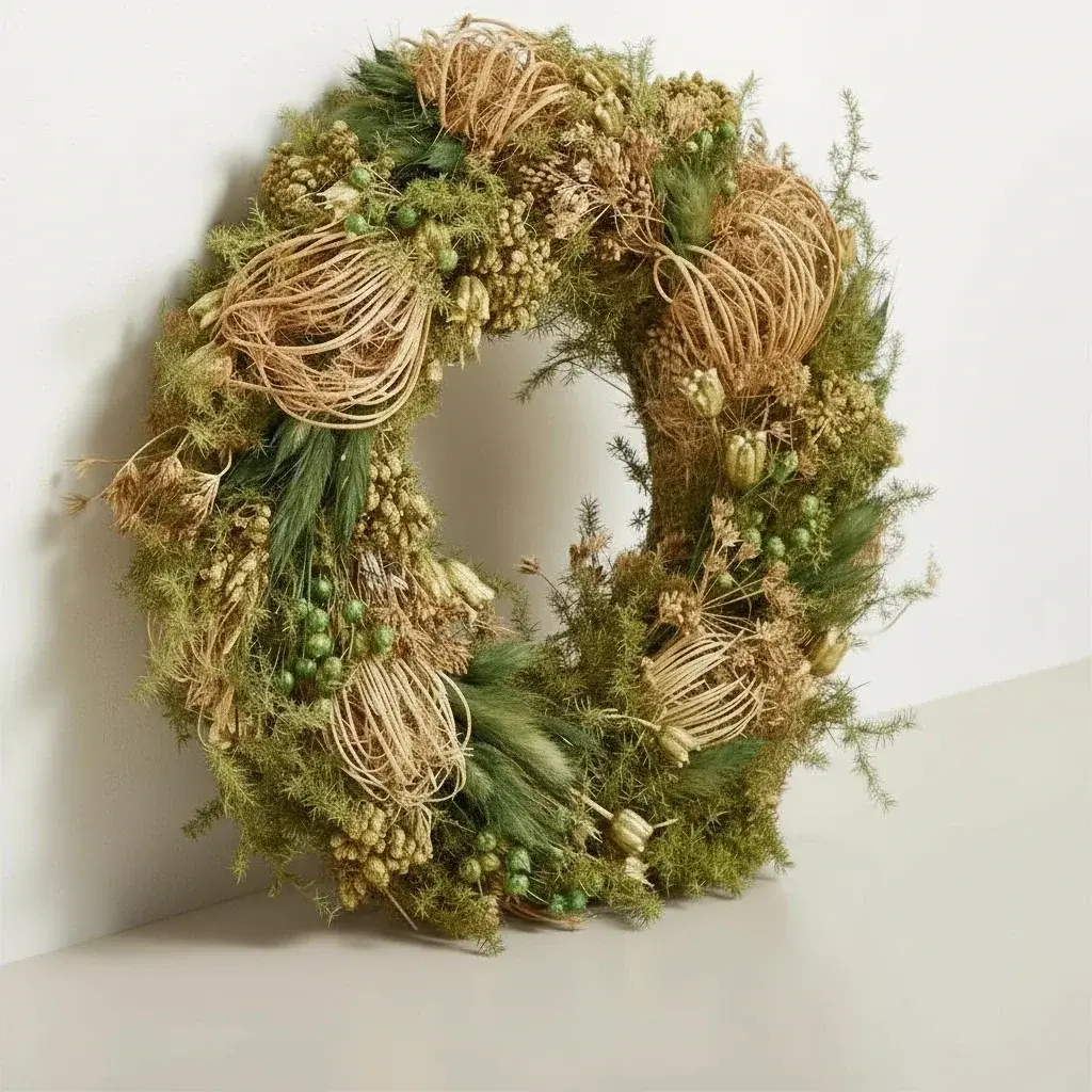 Discover the Wild Gold Wreath, a masterpiece of floral design from Cyrine Flowers. This exquisite piece captures the untamed beauty of nature, artfully arranged to bring a warm, inviting charm to your home. Each wreath is meticulously handcrafted using premium natural materials, ensuring a unique and long-lasting decorative statement.